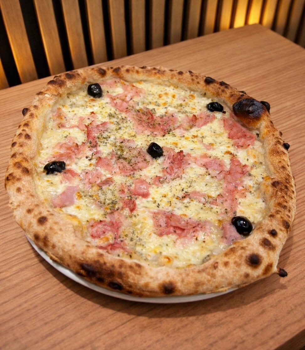 La Deliziosa de la simplicité née l'excellence. Ne contient que des bons produits : Crème, Jambon, Gorgonzola, Herbes de provence, Mozzarella fior di latte, Olives.